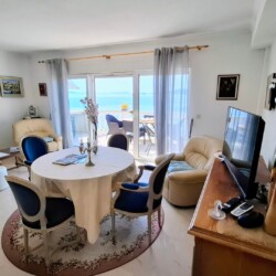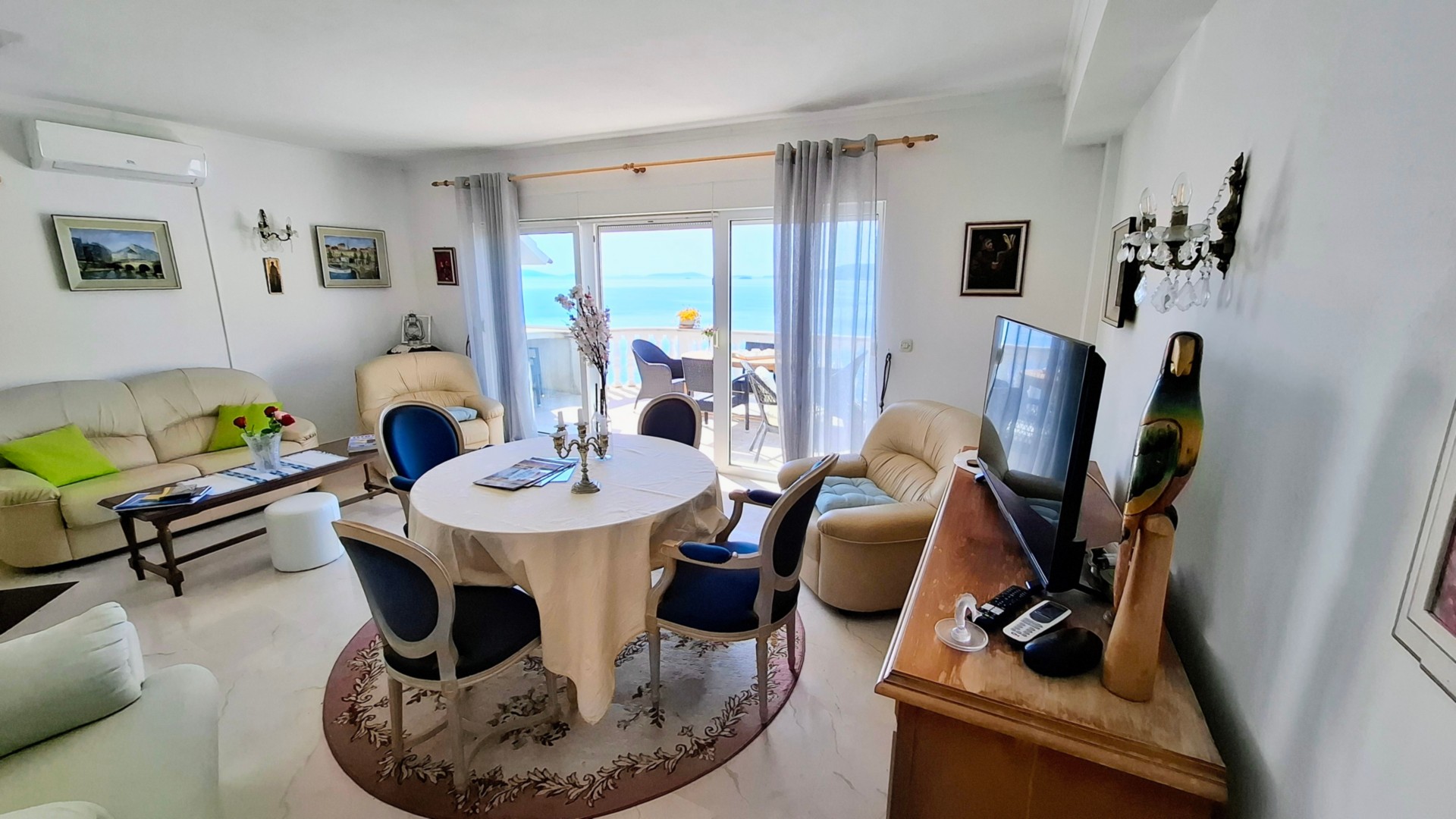 The bright and comfortable living room with a dining area opens onto a large balcony with spectacular sea views. The balcony is equipped with an outdoor dining table, chairs, and a lounge area, making it the ideal setting for al fresco dining or relaxing with a glass of wine in the evening. A barbecue is also available on the balcony for guests who enjoy outdoor cooking.