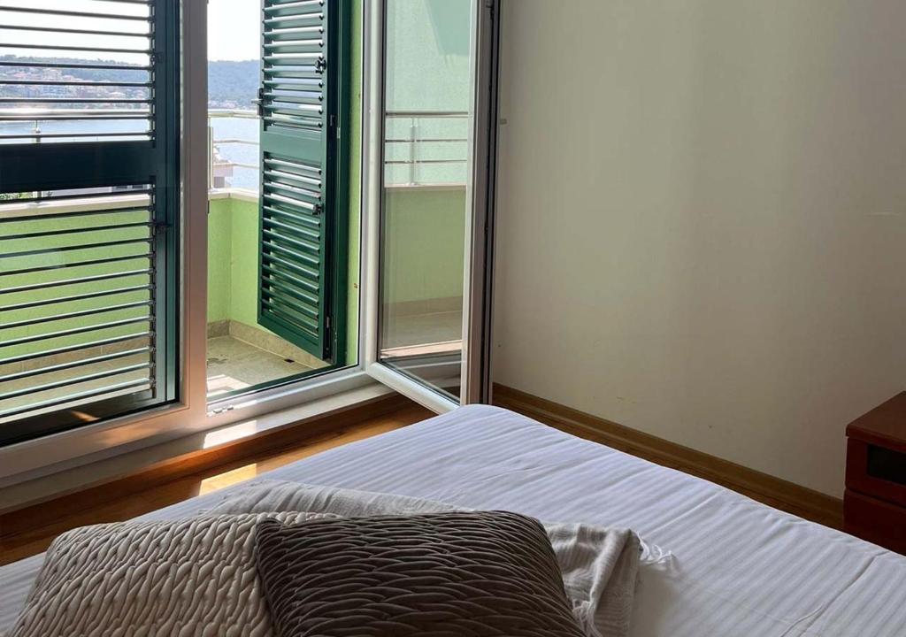 One bedroom is furnished with a king-size bed (180 × 200 cm), while the second includes two single beds— ideal for families or friends traveling together. The living room opens onto a spacious covered balcony with outdoor seating, ideal for relaxing while admiring the panoramic views of the entire bay.