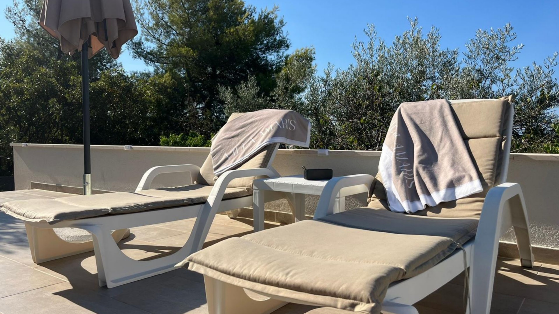Apartment Amaris B is located on the ground floor and covers 100 m2 of bright and comfortable living space, along with a private balcony boasting a breathtaking sea view. The apartment comfortably accommodates up to 6 guests (4+2) and features 2 bedrooms, 2 bathrooms, a fully equipped open-plan kitchen, dining area, and living area with a sofa bed for 2 persons.