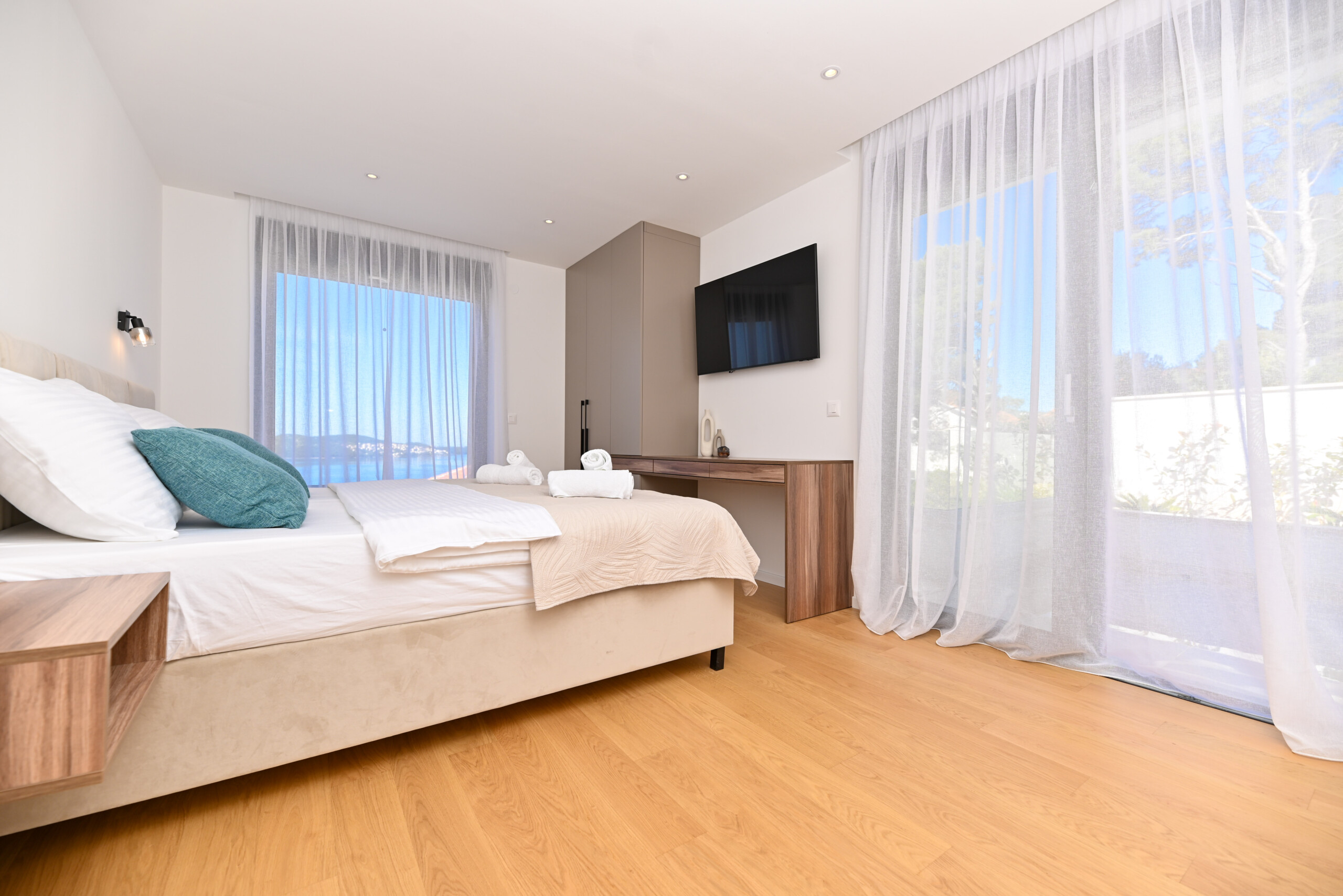 The second floor is designed as a resting area with 4 bedrooms with king size double beds and en suite bathrooms. Two bedrooms have access to the spacious seaview balcony.