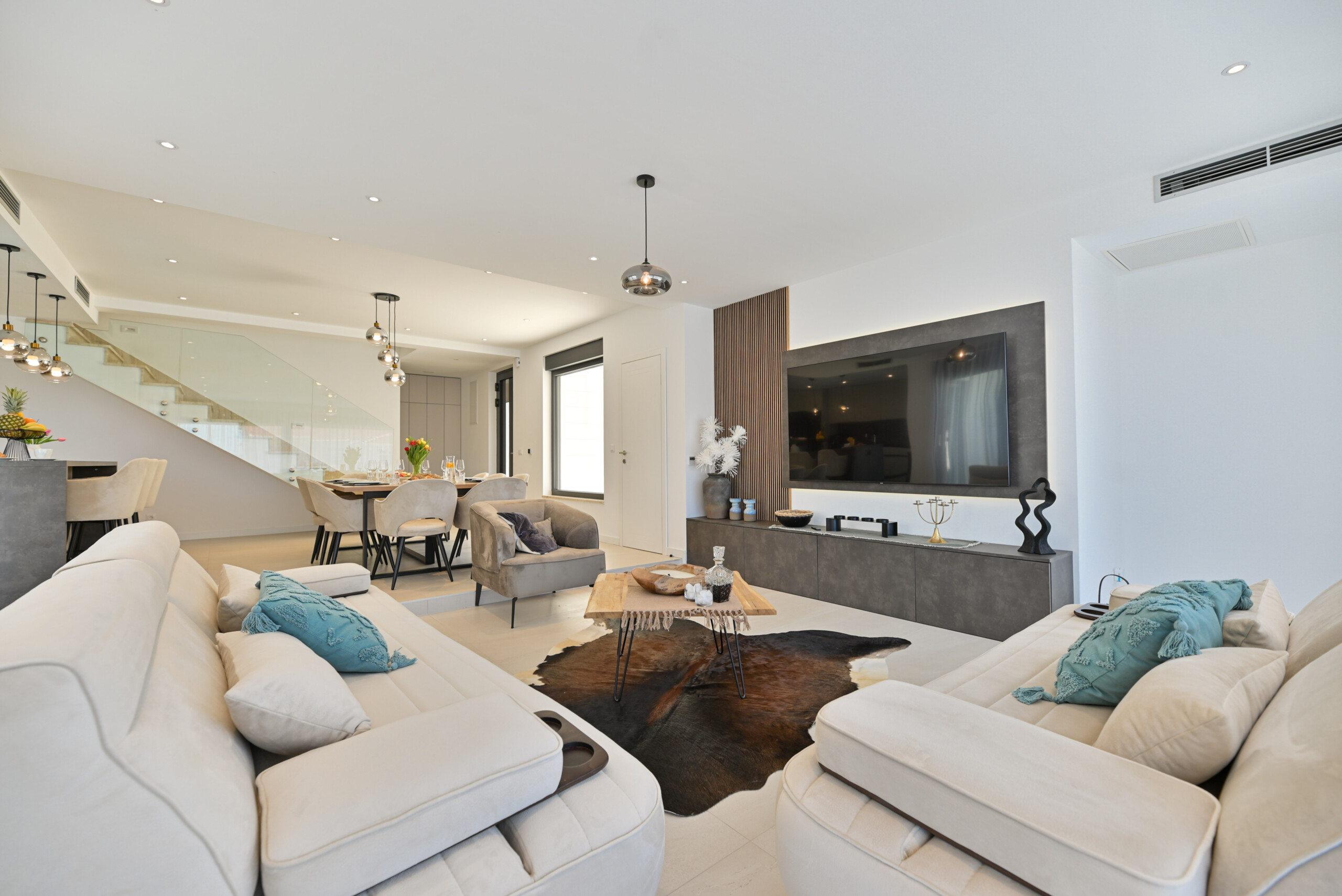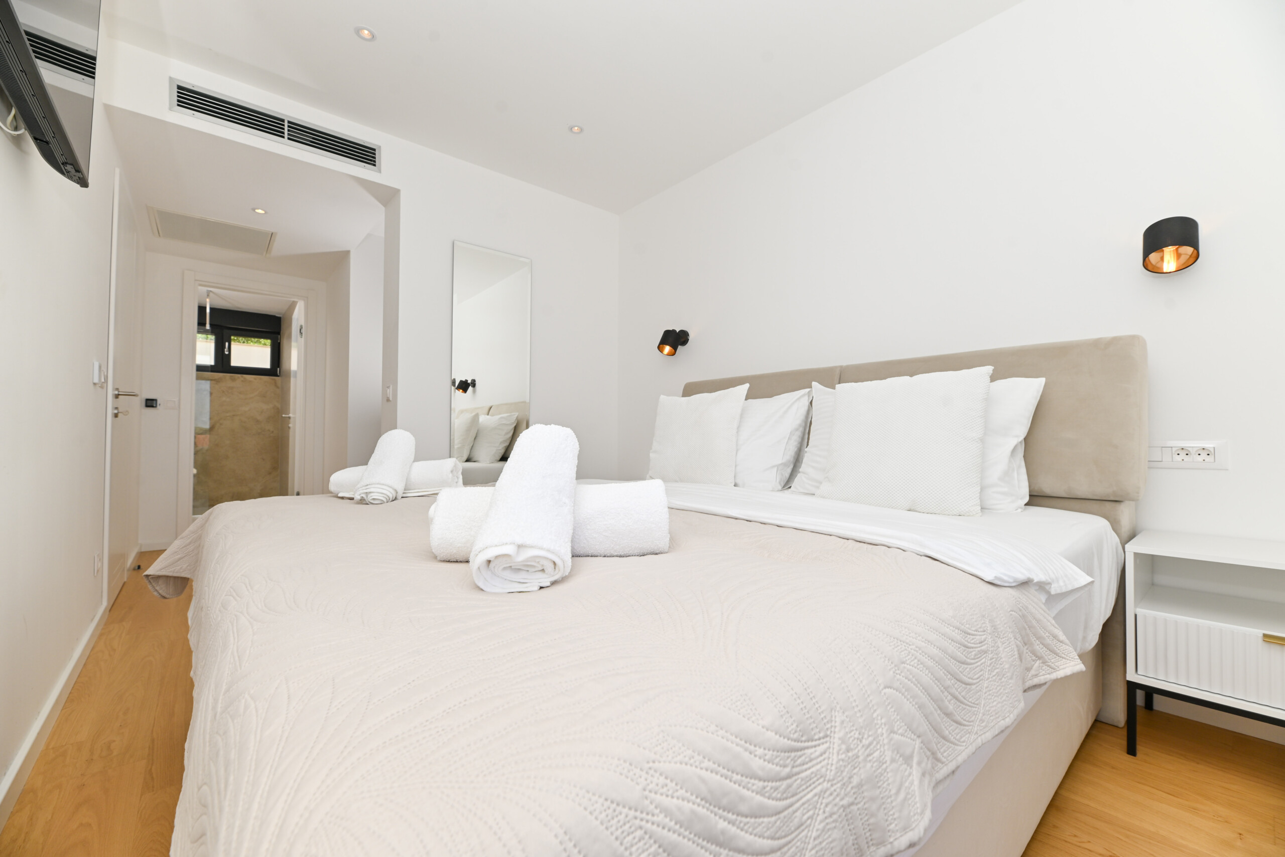 The ground floor includes a private garage with direct internal access to the main living area on the first floor. Here, you’ll find a bright open-concept space with a fully equipped kitchen, elegant dining area, and a stylish living room that opens onto a spacious terrace. This level also features one bedroom with a king-size bed, en suite bathroom, and a laundry room.