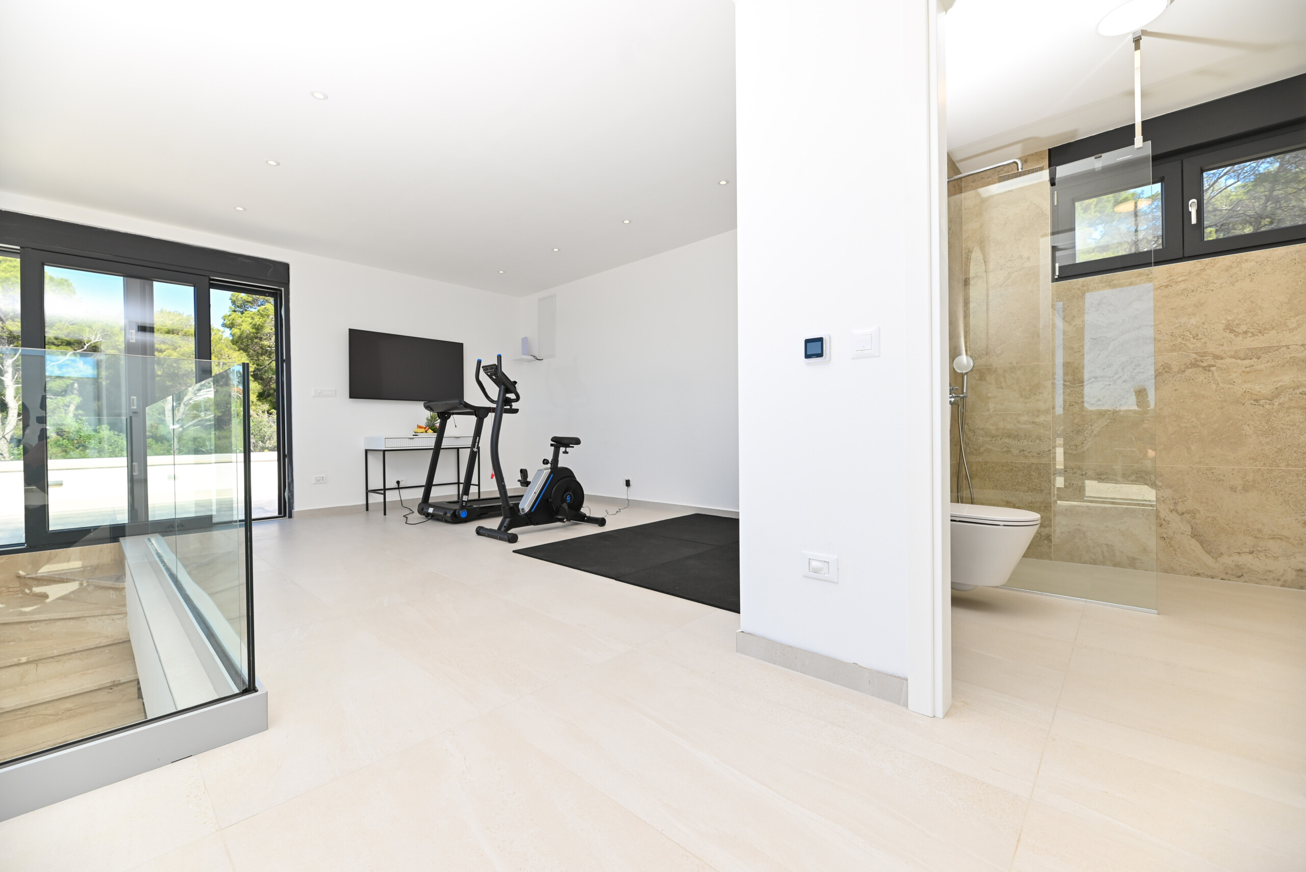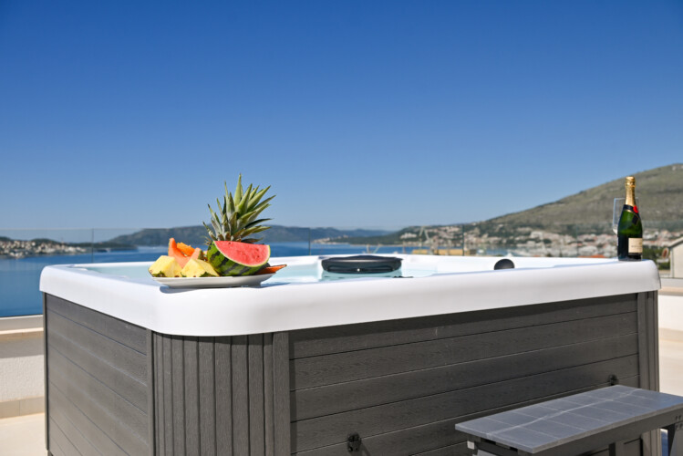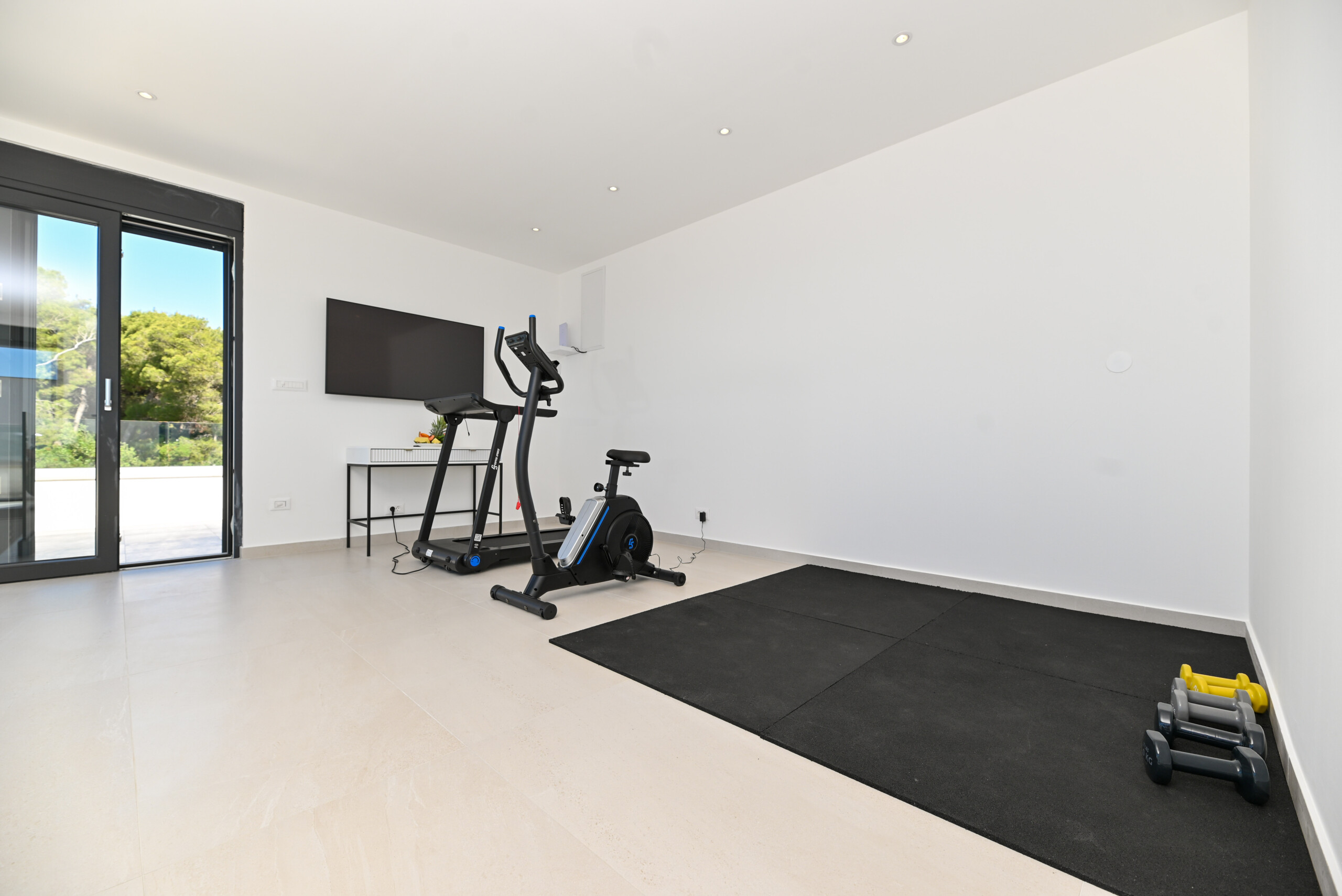 Third floor features a private gym with an additional bathroom with shower and access to the rooftop terrace. The terrace provides a truly special experience, featuring a jacuzzi and sun loungers. It’s the perfect place to unwind with a glass of wine while taking in panoramic views of the bay.
