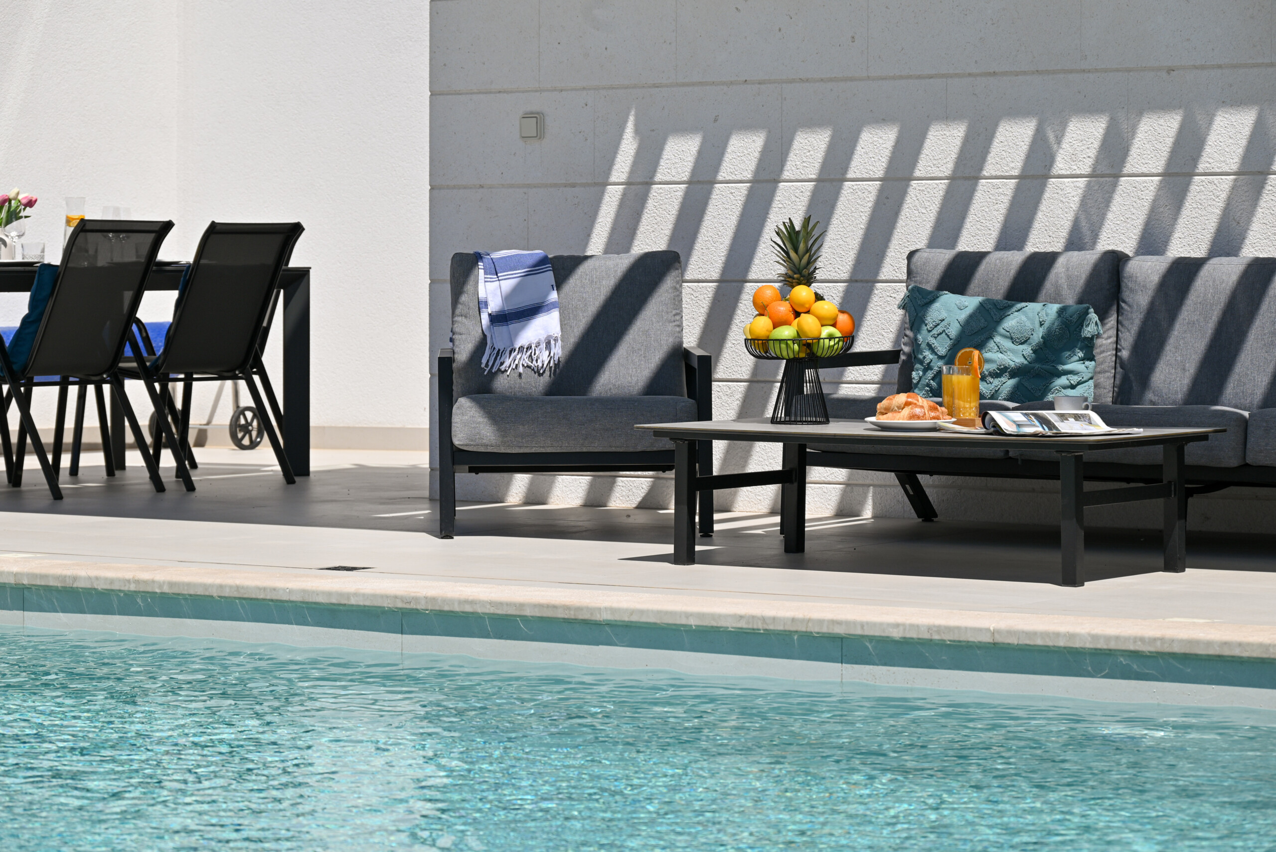 Step outside to your private oasis: a heated swimming pool (32m2) with massage jets, surrounded by sun loungers and complemented by an outdoor dining area—perfect for relaxed al fresco meals under the Mediterranean sky.